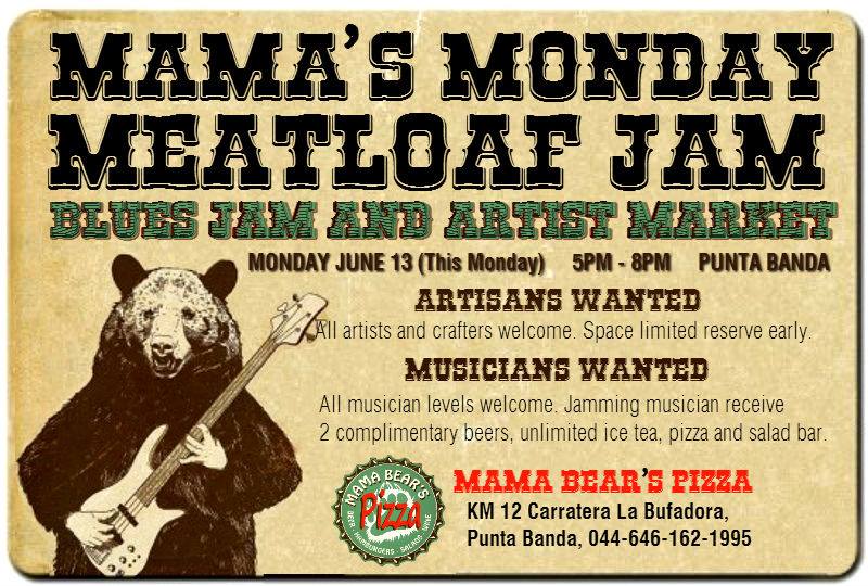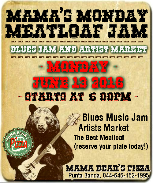 All musicians are welcome at the weekly Meatloaf Jam, being held at Mama Bear's Pizza in Punta Banda, every Monday afternoon from 5PM to 8PM. It is their world famous Meatloaf. Monday, that is now adding a community blues jam and artists market.