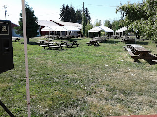 The backyard is a 3-acre beer garden, with lawn, surrounded by tall trees and bamboo. The stage sat directly in front of a large fenced in a forest of bamboo. The Den (our RV) sat opposite the stage behind the bamboo, completely hidden. The stage was a 16' x 12' and covered for shade, unfortunately, at the time we performed the sun was set low enough to ignore the shade altogether and cooked us, well done on one side.